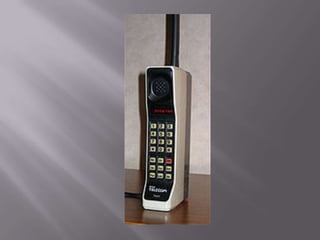 The document traces the history and development of mobile phone technology from 1G analog networks in the late 1970s to the emergence of 3G networks in the early 2000s. It discusses the transition from large analog "brick" phones to smaller handheld devices enabled by advancing technology and dense cell site networks. Key developments included the introduction of SMS text messaging and downloadable ring tones in the 2G era and the launch of the first 3G networks and smartphones capable of high-speed data and internet access.