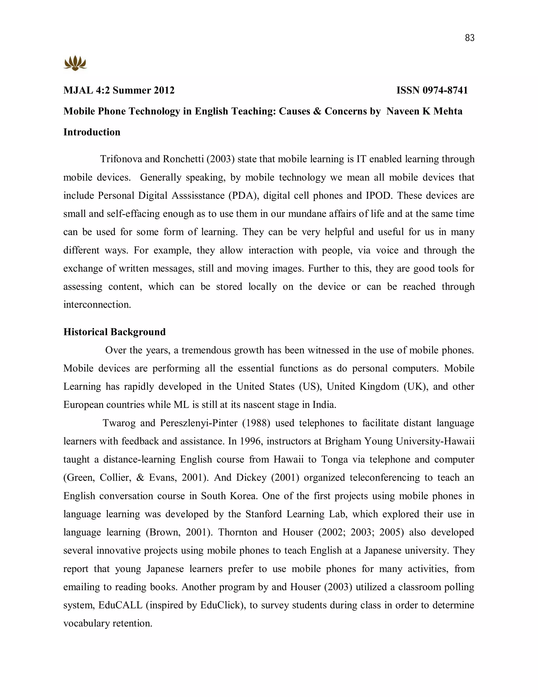This document discusses the use of mobile phone technology in English language teaching. It outlines how mobile phones can be used as part of mobile assisted language learning (MALL) to make English learning more interactive and accessible to students. The document reviews related research on MALL and describes various activities and features of mobile phones that can be harnessed for English instruction, such as voice recording, SMS, internet access, downloading materials, and using the camera. Both the advantages and limitations of MALL are discussed. The document concludes that while mobile phones have great potential to support language learning, their use also requires addressing challenges like small screens and consideration of best practices.