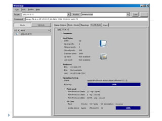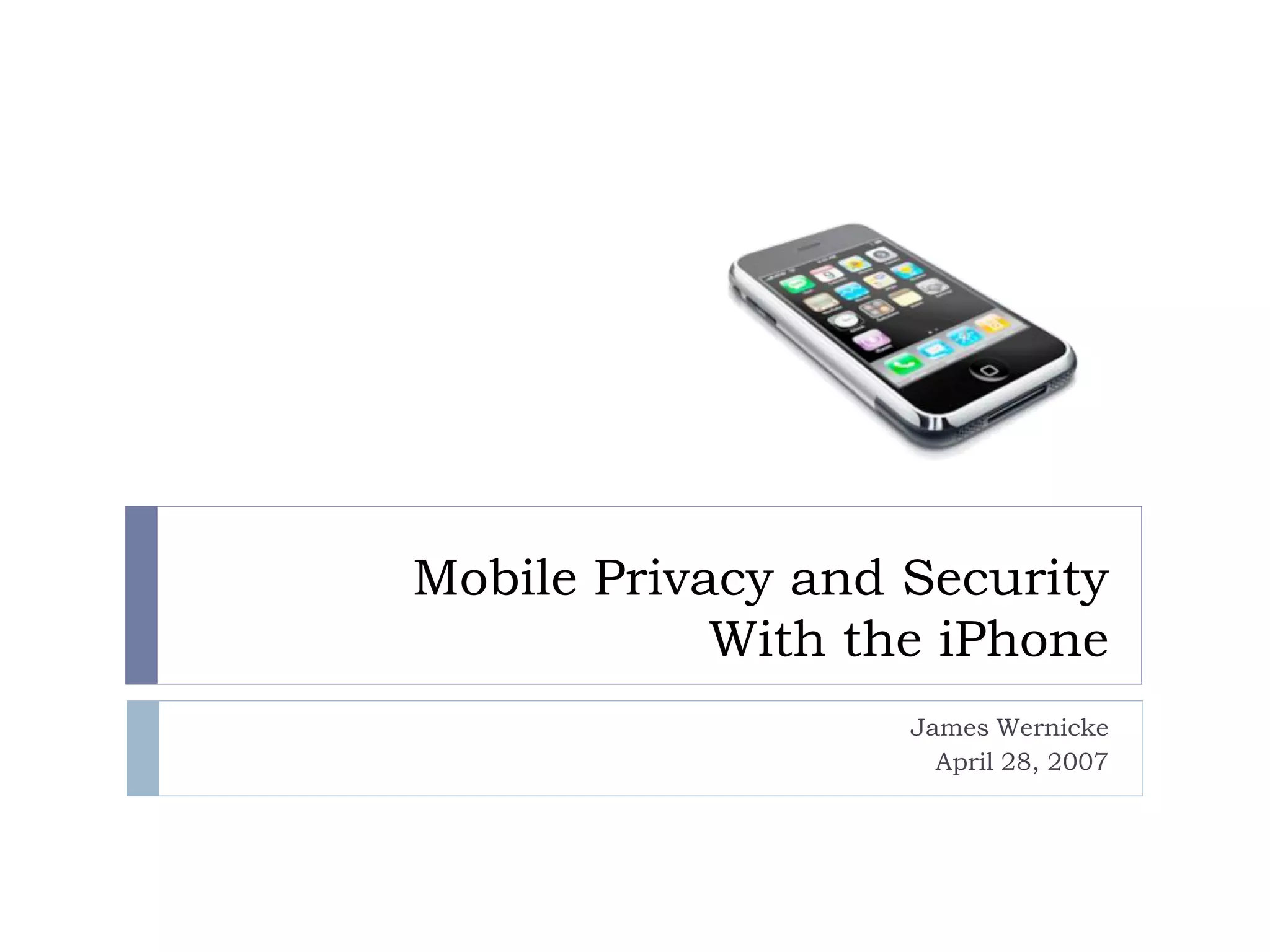 The document summarizes a security audit performed on an iPhone. The researcher was able to gain root access to the iPhone using a default password for OpenSSH. They then analyzed over 2000 property list files, converting them to XML and searching for personal information like names, phone numbers, emails and call logs. The researcher extracted a significant amount of private data and notes that with malicious intent, data could also have been deleted or erased without a trace. Recommendations include changing default passwords, limiting app access to data, and not leaving wireless connections active when not in use.
