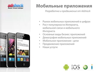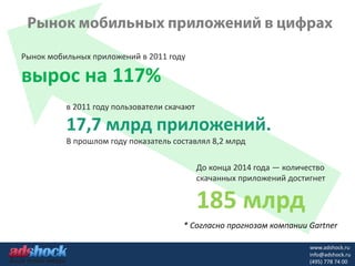 Рынок мобильных приложений вырос на 117% в 2011 году, пользователи скачали 17,7 млрд приложений. Запуск мобильного приложения может повысить лояльность клиентов, увеличить продажи и создать новые каналы взаимодействия. Документ также описывает стратегии продвижения приложений через различные маркетинговые платформы и технологии.