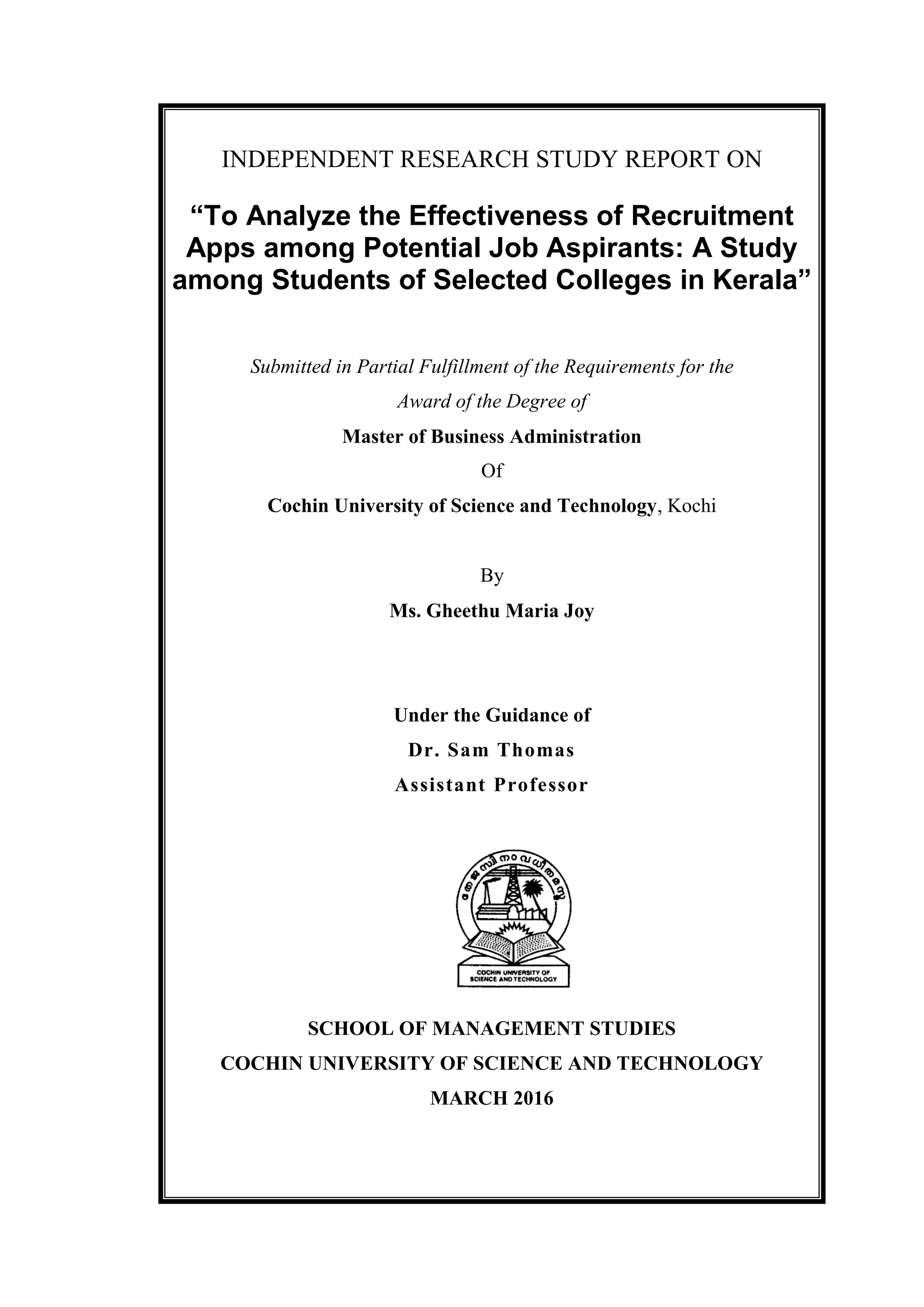 This document is an independent research study report submitted by Gheethu Maria Joy to fulfill the requirements for a Master of Business Administration degree from Cochin University of Science and Technology. The report examines the effectiveness of recruitment apps among potential job applicants who are students at selected colleges in Kerala. The study was conducted under the guidance of Dr. Sam Thomas. The report includes sections on the declaration, acknowledgements, table of contents, executive summary, literature review, research methodology, data analysis, findings, conclusions, and references.