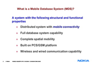 The document discusses security considerations for mobile databases. It notes that mobile users need to work offline due to poor connections, and applications need access to local hardware. It also describes location dependent data and location independent data. The document recommends using HTTPS to synchronize mobile and central databases securely and encrypting the local mobile database for protection. Database triggers are used to control user access and authorization for data manipulation.