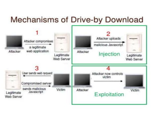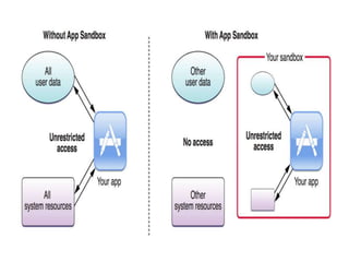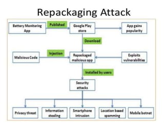 The document discusses various aspects of Android security. It covers kernel security features like process isolation and permissions. It describes how the application sandbox isolates apps and assigns unique IDs. It also discusses system security mechanisms like encryption, verified boot, and updates. Common Android vulnerabilities are outlined like rooting, repackaging apps, update attacks, and drive-by downloads.
