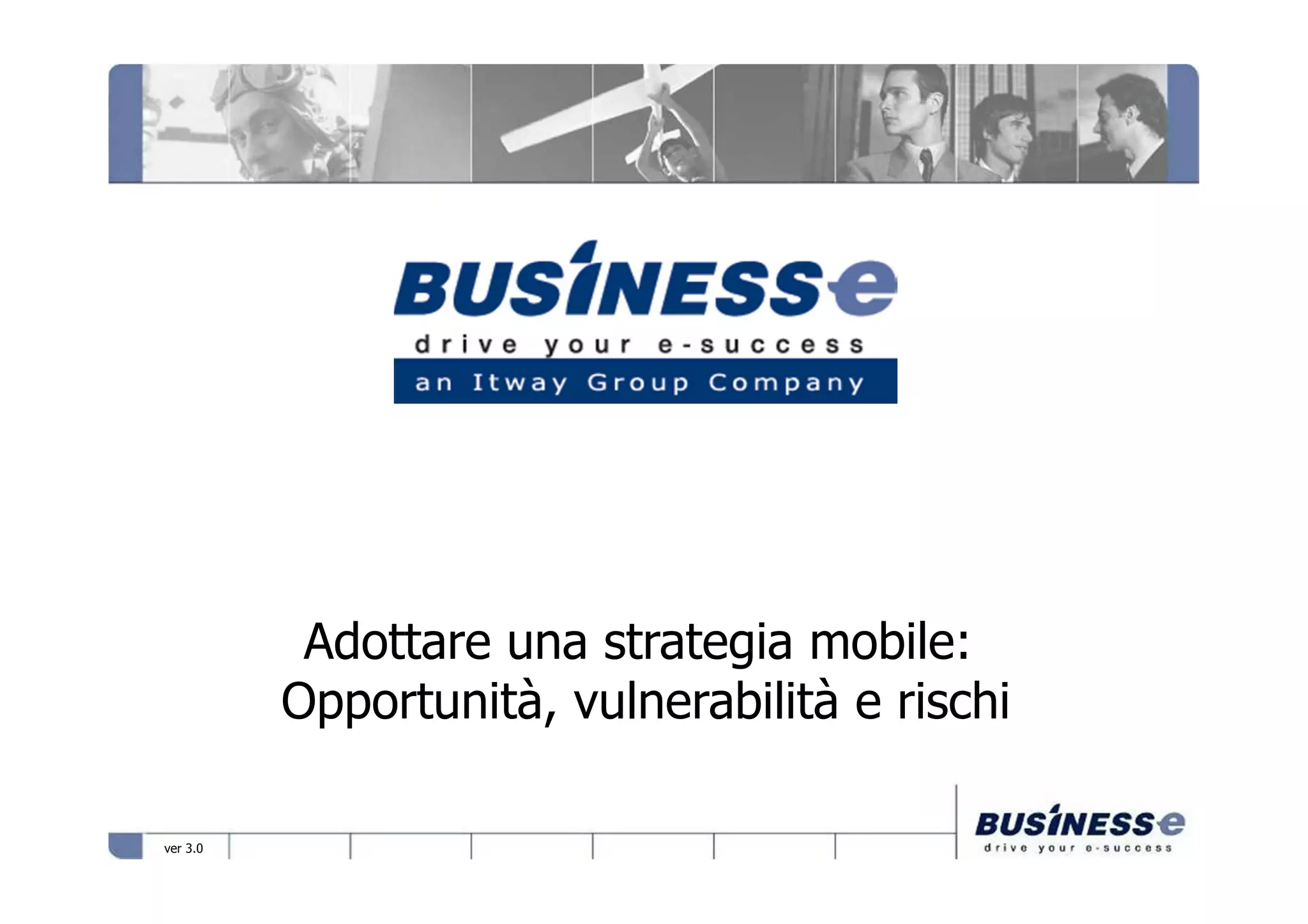Il documento analizza l'adozione della strategia mobile, evidenziando opportunità e vulnerabilità legate all'uso crescente dei dispositivi connessi. Sottolinea i rischi associati alla consumerizzazione, come malware e furto di dati, e l'importanza della consapevolezza degli utenti nei confronti della sicurezza. Propone strategie di difesa, inclusa l'educazione degli utenti e l'applicazione di politiche di gestione dei dispositivi mobili.