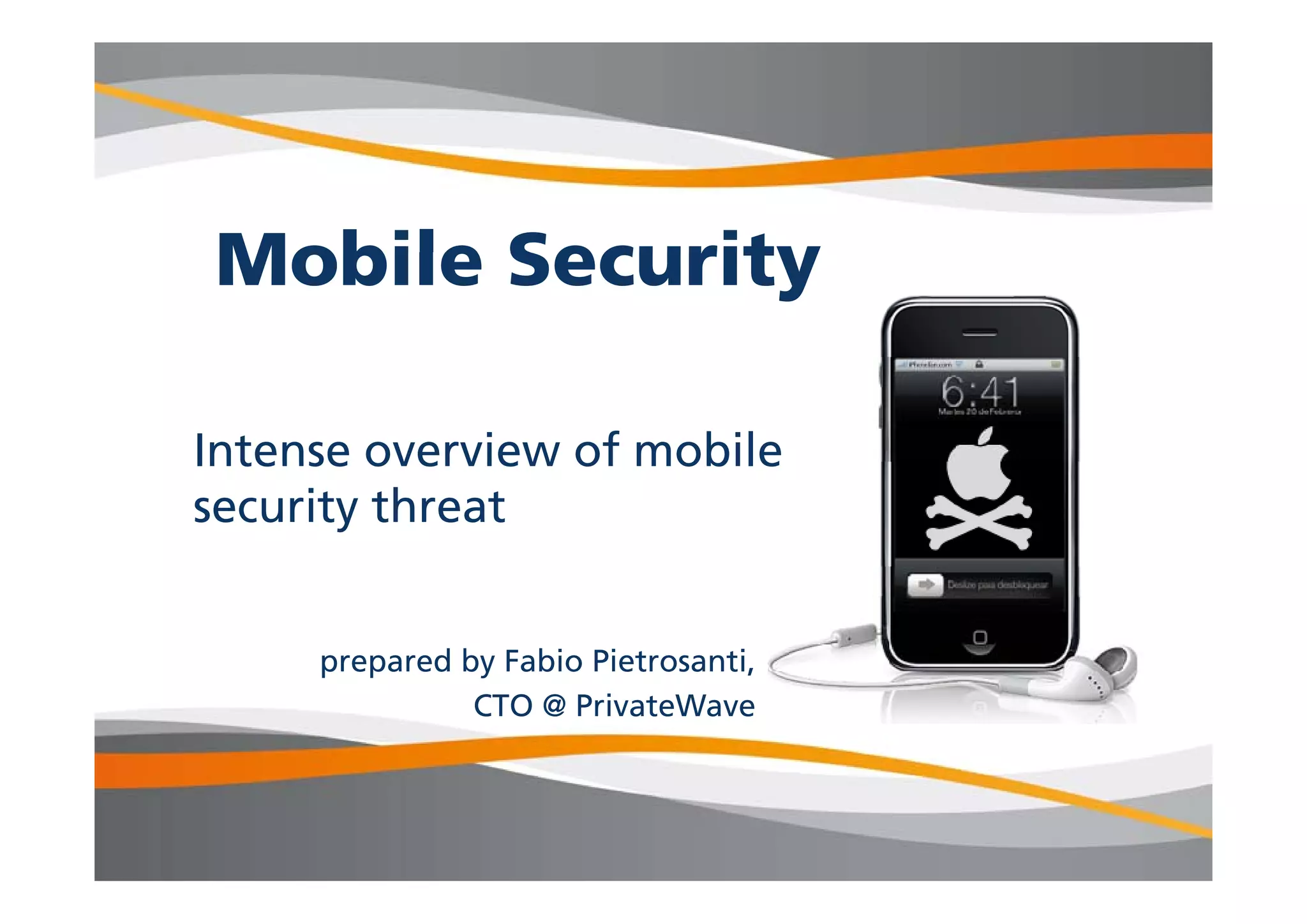 This document provides an overview of mobile security threats and discusses mobile security compared to traditional IT security. It covers several topics related to mobile device security including the different security models of mobile operating systems, development language security, and mobile hacking attack vectors. The document is an introduction to mobile security presented by Fabio Pietrosanti, CTO of PrivateWave.