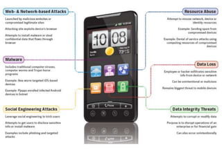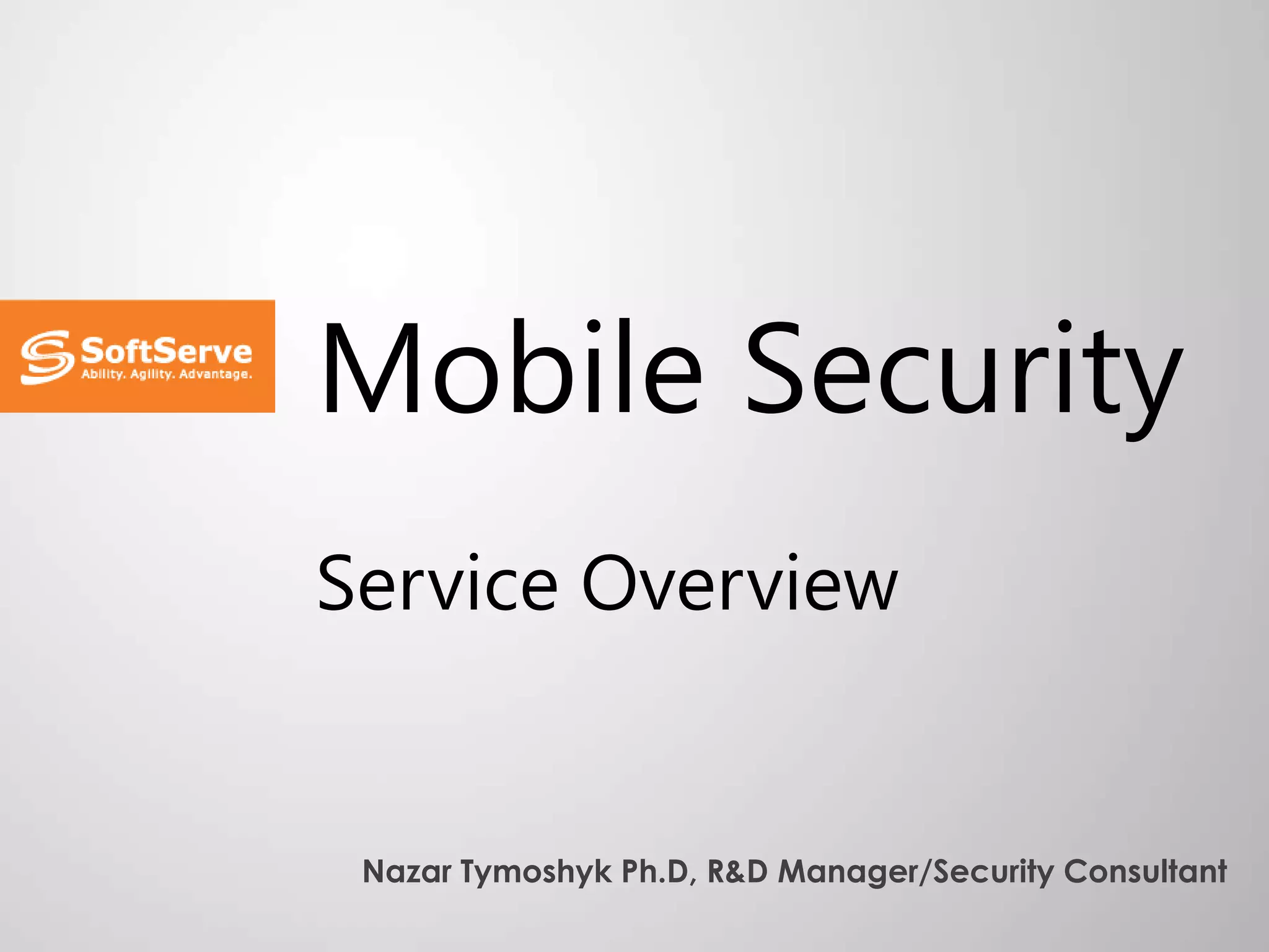 This document provides an overview of mobile security concerns and services offered by SoftServe. It discusses key mobile security risks like confidential data leakage, insecure data storage and transmission, and vulnerabilities in mobile applications. SoftServe's mobile security portfolio includes mobile application security assessments, mobile forensics, mobile network security assessments, and mobile device management. The services help identify vulnerabilities, manage policies and devices, and control security and access to address risks.