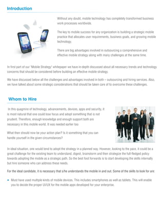 The document discusses the importance of a strategic mobile strategy for organizations, weighing the pros and cons of hiring versus outsourcing mobile solutions. It emphasizes the need for a well-rounded skill set in candidates or partner organizations to successfully manage mobile strategy development and implementation. Additionally, it outlines key considerations for planning an effective mobile approach, including understanding user needs, security concerns, and long-term organizational goals.