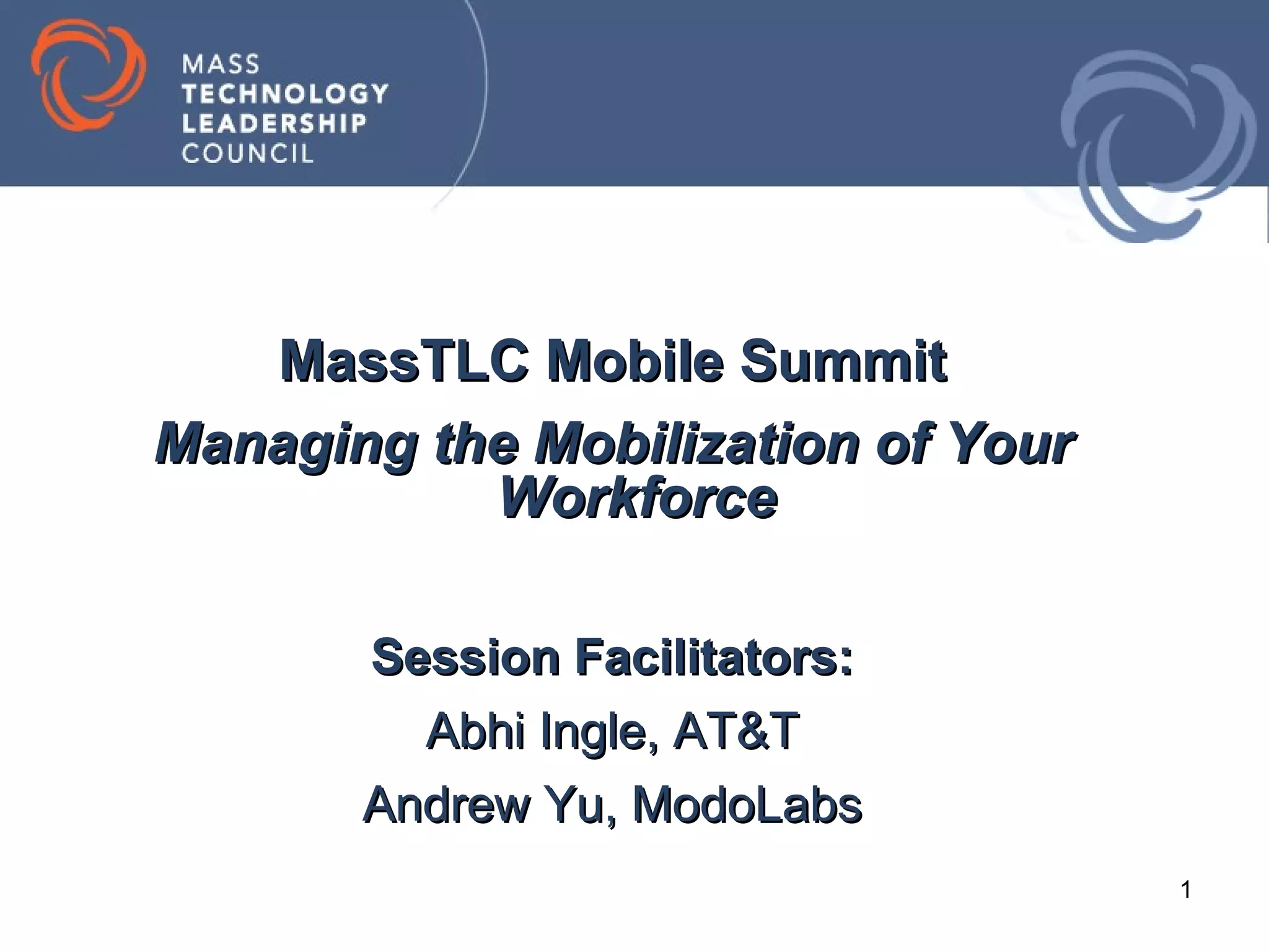 This document summarizes a MassTLC Mobile Summit session on managing workforce mobilization. The session will be facilitated by Abhi Ingle from AT&T and Andrew Yu from ModoLabs. Ground rules for the session include it being a knowledge exchange where the facilitators will keep the discussion moving and ensure all participants have an opportunity to contribute. Key topics to be covered include BYOD, developing and distributing internal apps, wireless networking, security through mobile device management, supporting a variety of mobile devices, and addressing issues like platform fragmentation. The session aims to help organizations align their mobile technology, business needs, and employee usage.