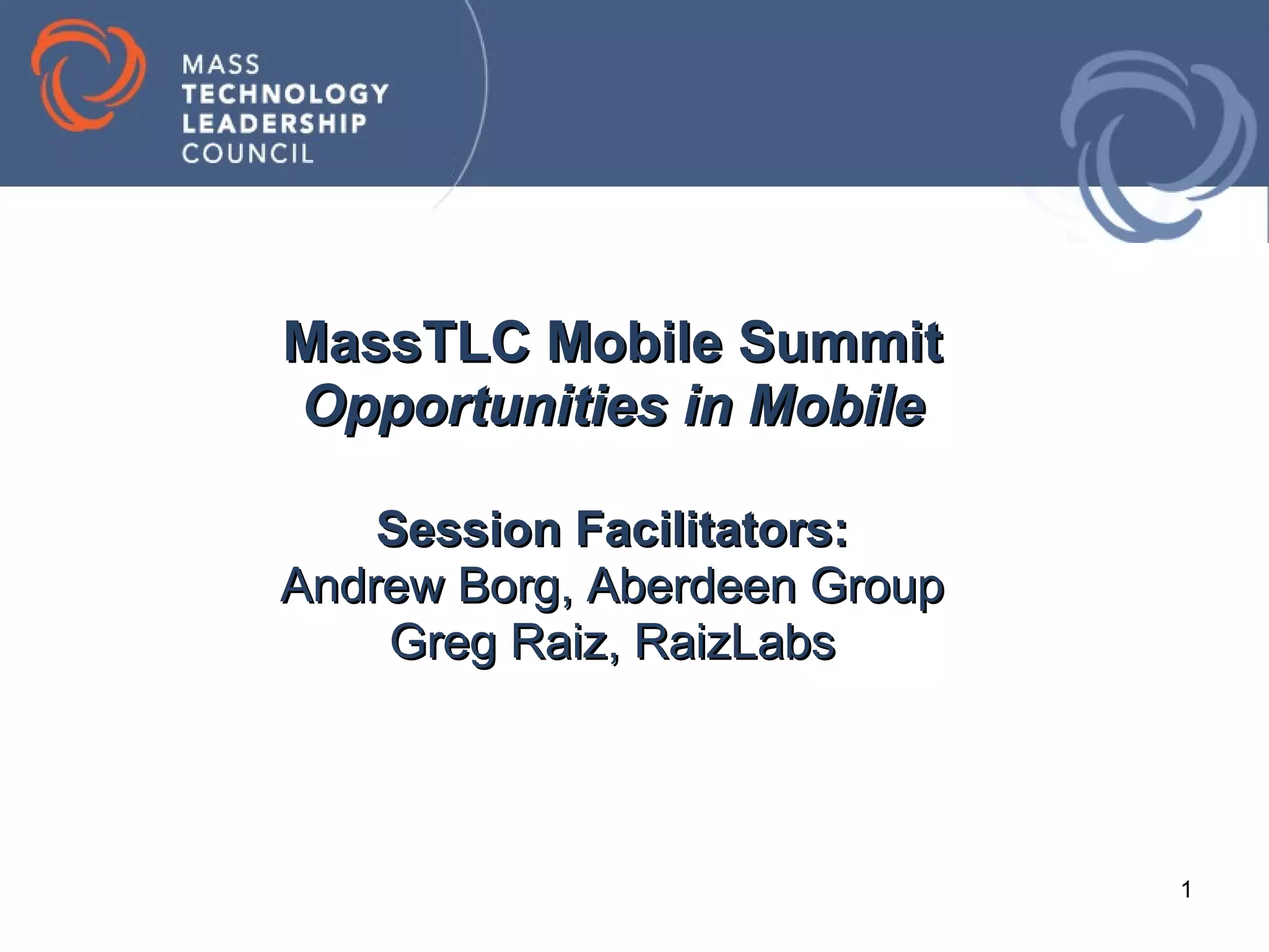 The MassTLC Mobile Summit will discuss opportunities in mobile technology. Session facilitators Andrew Borg and Greg Raiz will set the agenda and keep discussions focused on trends like enterprise apps and BYOD, consumer apps and mobile wallets, approaches to app building, monetizing apps, and future technologies like cloud, virtualization, and machine-to-machine communication. Ground rules are that it is a knowledge exchange where all participants can contribute and the facilitators will ensure an orderly discussion.