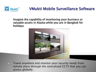Vmukti offers mobile surveillance software enabling remote monitoring of businesses and assets from anywhere in the world. The software features include instant setup, multi-feed with zoom functionality, and support for high-quality video capture on limited bandwidth. It is designed for various users, including government organizations and police departments, with capabilities for intelligent mobile van surveillance systems.