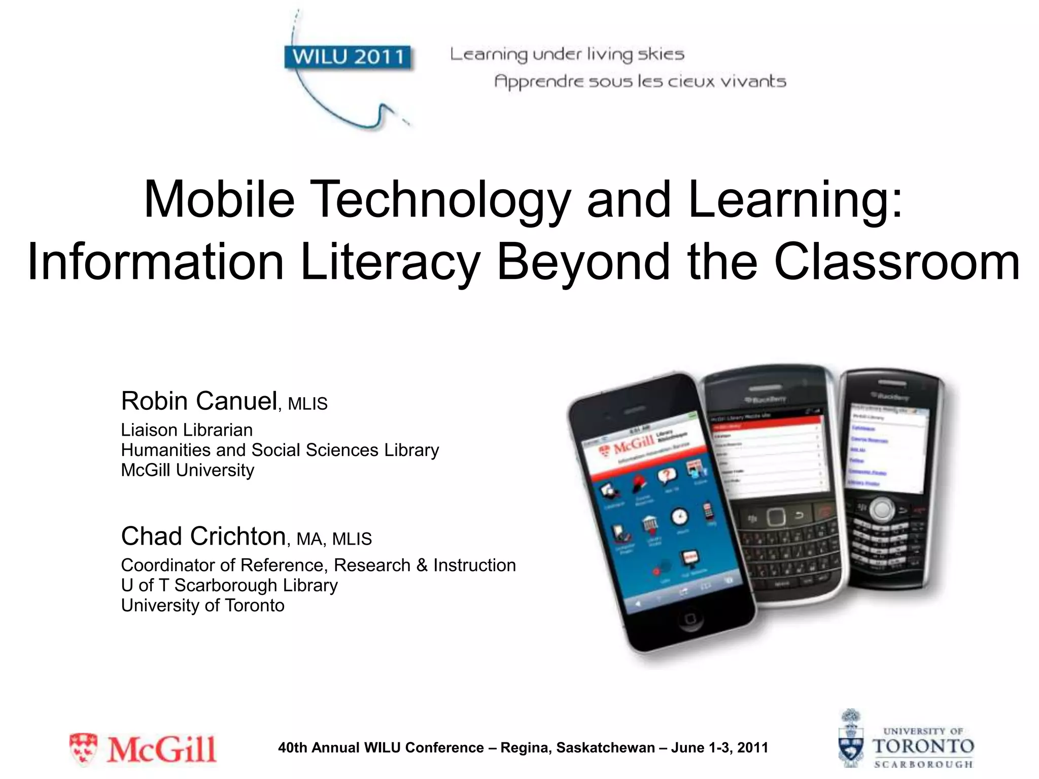 This document discusses mobile technology and information literacy beyond the classroom. It provides an overview of current mobile device usage statistics and how this impacts learning. Mobile information literacy is discussed, as well as integrating mobile technologies into information literacy instruction both inside and outside the classroom. Challenges and opportunities for academic libraries in developing mobile resources and services are also examined.