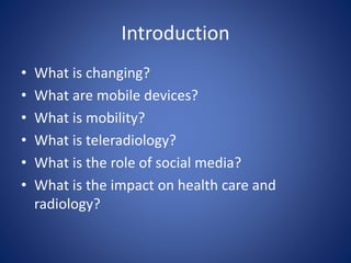 The document explores the transformative impact of mobile devices and teleradiology on healthcare, emphasizing the need for radiologists to adapt to mobile technology for improved patient care and consultation. It highlights the advantages of mobile tools, such as enhanced efficiency and faster access to images, while also addressing concerns around patient privacy and data security. Overall, it calls for a responsible and strategic approach to integrating mobile technology in radiology practices.