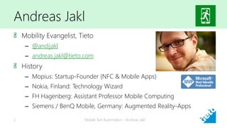The document presents a comprehensive overview of mobile test automation, emphasizing its importance in ensuring app functionality across various devices and OS versions. It discusses testing strategies, tools, and methodologies, including the significance of user feedback and the impact of app updates on customer retention. Additionally, it highlights automated testing capabilities through platforms like Xamarin Test Cloud and other tools to enhance testing efficiency and reliability.