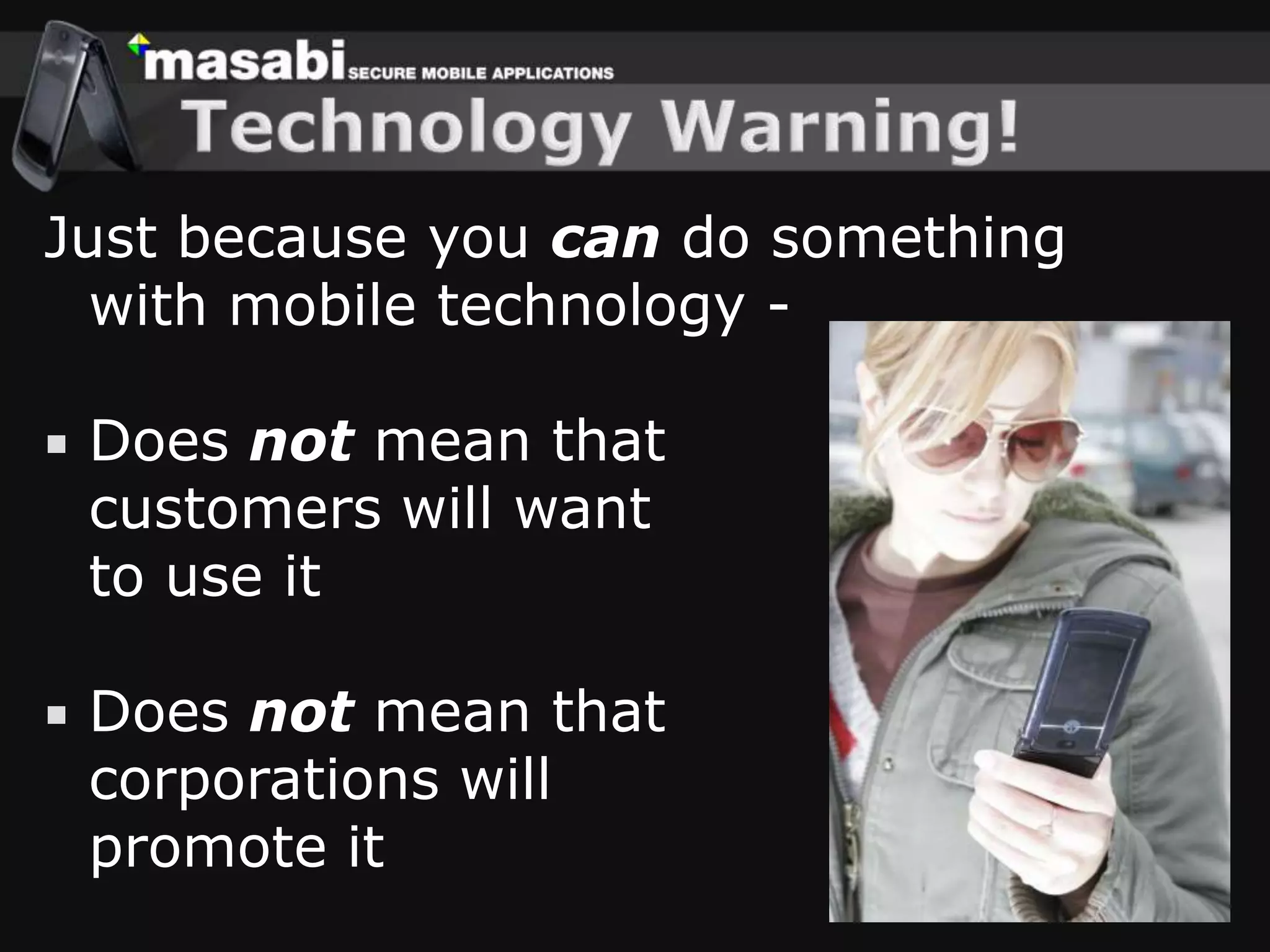 This document discusses mobile ticketing for rail travel. It begins by noting that while new mobile technologies are possible, customers will only adopt them if the old way of doing things is painful and the new way is better. It then discusses how Masabi has defined an official UK rail barcode standard for mobile tickets that allows customers to purchase tickets on their phone to avoid queues. The document outlines the key usability points of Masabi's mobile ticketing apps, such as no sign-up process and fast repeated purchases. It also discusses the benefits for customers of avoiding queues and for rail operators of lower costs per ticket sale.