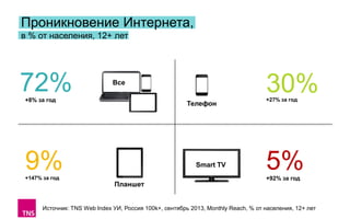Документ представляет собой анализ роста аудитории мобильного интернета в России за период с 2007 по 2013 год, с акцентом на увеличение числа пользователей и устройств. Указывается, что уровень проникновения интернета среди населения, старше 12 лет, составляет 72%, при этом мобильный интернет демонстрирует значительный рост среди пользователей. Также рассматриваются предпочтения пользователей по использованию различных мобильных приложений и целей их использования.