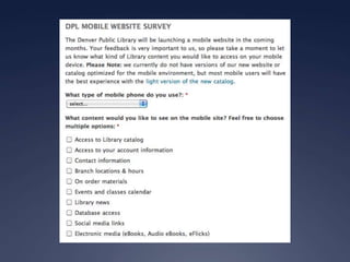 The document discusses usability testing for mobile sites and applications. It emphasizes that mobile usability requires designing for small screens and brief interactions, as mobile users have immediate and context-dependent information needs. The document recommends testing across different hardware, software, and interface factors using various methods including paper prototypes, desktop simulations, device emulators, field testing, and lab evaluations.