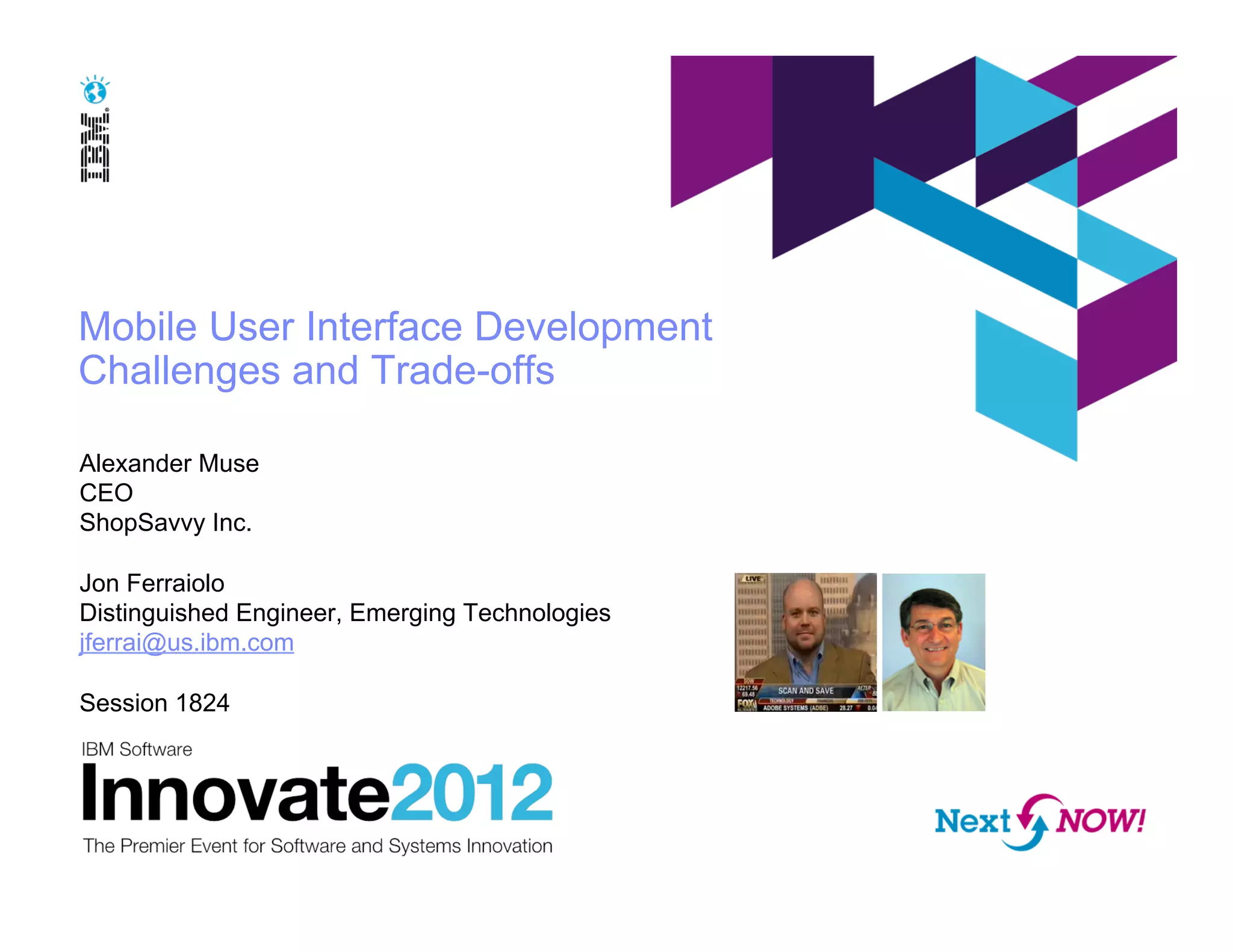 The document discusses mobile user interface development challenges and trade-offs, highlighting the success story of the Shopsavvy app and its evolution across multiple platforms including Android and iOS. It contrasts design philosophies of major mobile operating systems, emphasizing differences in usability, interface guidelines, and technical tools available for developers. Additionally, it introduces mobile HTML5 tools and toolkits to support developers in creating cross-platform mobile applications.
