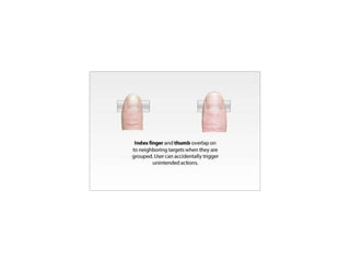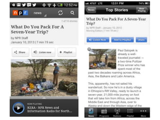This document discusses mobile UX design. It notes that 75% of traffic now comes from mobile apps and that mobile usage is approaching a majority. When planning an app, developers must choose between native and HTML approaches. Native apps have advantages like unlimited hardware access and offline use but are more expensive to develop, while HTML is cheaper but lacks some capabilities. The document emphasizes designing for insights about users rather than ideas, using qualitative research to understand why problems exist. It also stresses knowing users, doing one thing well, focusing on the user experience above all else, moving quickly through iterations, and providing natural and intuitive experiences through careful attention to details.