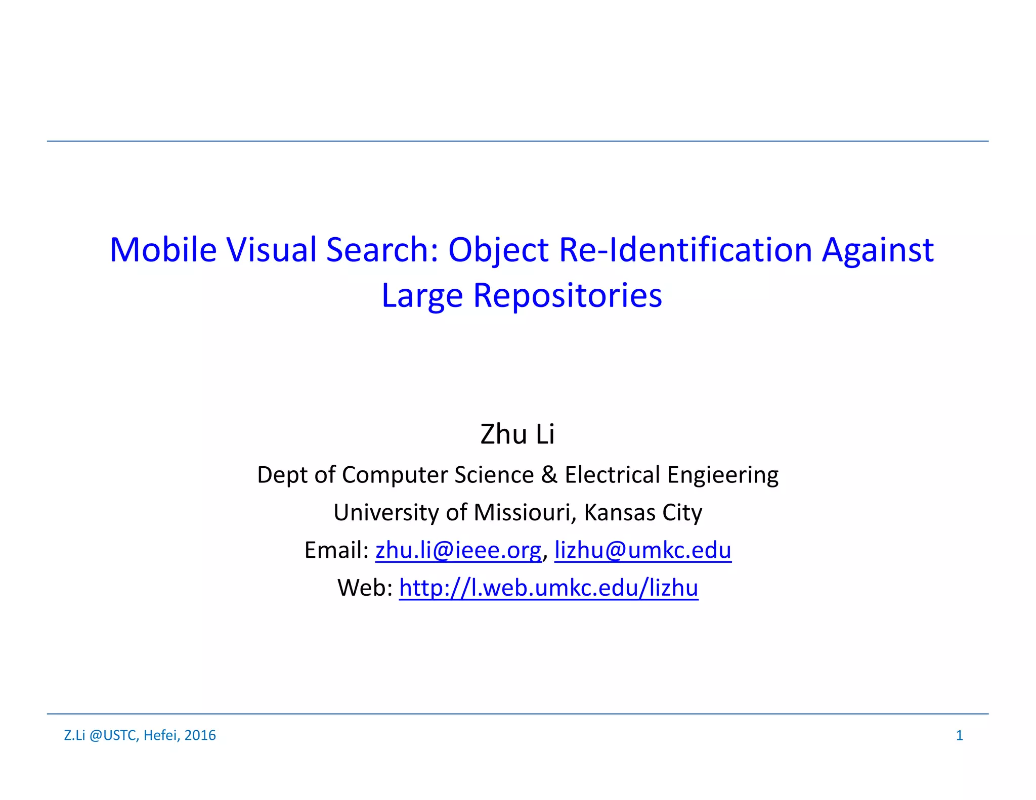The document presents an overview of research on mobile visual search, focusing on object re-identification and image classification within large datasets. It outlines the techniques used for query extraction, compression, and indexing, as well as advancements in deep learning for image tagging. The work also highlights the importance of efficient data handling to achieve high precision in real-time performance for large visual repositories.