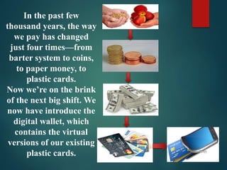 This document presents an empirical study on consumer perception of digital wallets among college students in Faridabad, exploring their adoption, influencing factors, and obstacles. It defines mobile wallets and outlines the technology's features, advantages, and challenges including system outages and security concerns. The study aims to understand students' views on this technological service and its potential impact on payment methods.