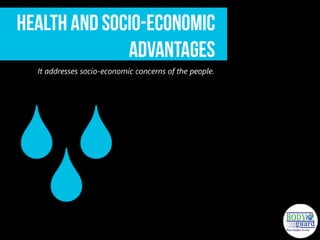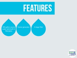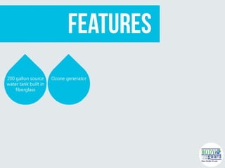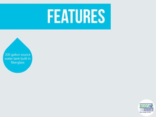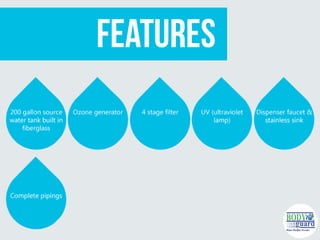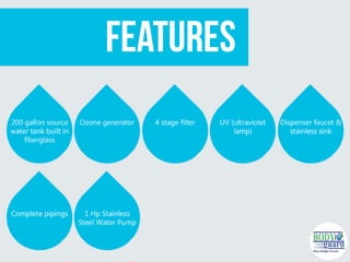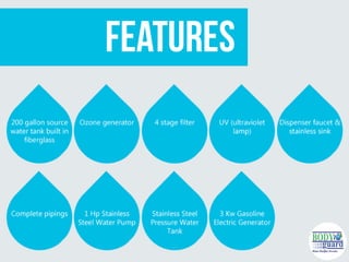 The mobile water purification system includes a 200-gallon tank, ozone generator, and multi-stage filtration to provide clean water, addressing key health and nutritional issues related to waterborne diseases and mineral depletion. It offers socio-economic benefits by providing water at 50-100% lower cost than competitors, with a return on investment possible within 12-18 months. The system is designed for easy operation and transportability, ensuring high-quality water delivery.
