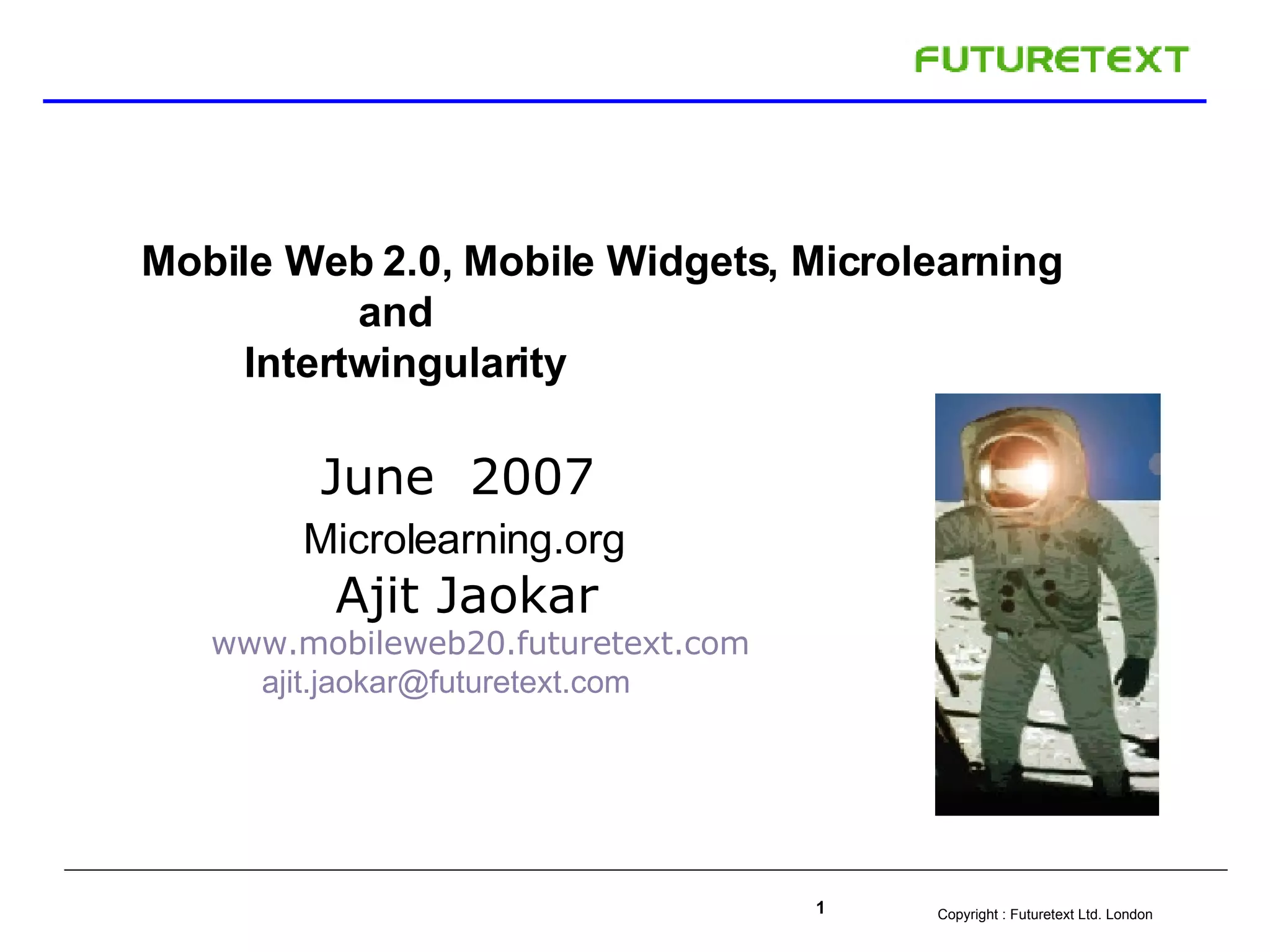 The document discusses several emerging concepts related to mobile learning including mobile web 2.0, microlearning, widgets, and intertwingularity. Mobile web 2.0 extends the principles of harnessing collective intelligence to mobile devices. Microlearning involves learning from small content units and short activities. Widgets are small, reusable web applications that can be used to deliver microlearning content on both desktop and mobile devices by leveraging open standards. Intertwingularity refers to the complex interrelationships between topics that are reflected in a fragmented and networked web.