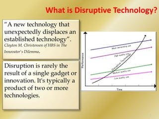 Mobile web technologies are the most disruptive technologies according to the document. Disruption occurs when a new technology unexpectedly displaces an established one. Some key mobile and internet technologies that have been disruptive include smartphones, wireless networks, cloud computing, social networks, and user interfaces. The future is in mobile broadband and the mobile web. Mobile app usage and downloads are growing significantly, especially for services related to money transfer, local search, health monitoring, payments, and messaging. India is also seeing major growth in mobile subscribers and usage, which will help close the digital divide as mobile access becomes more universal.