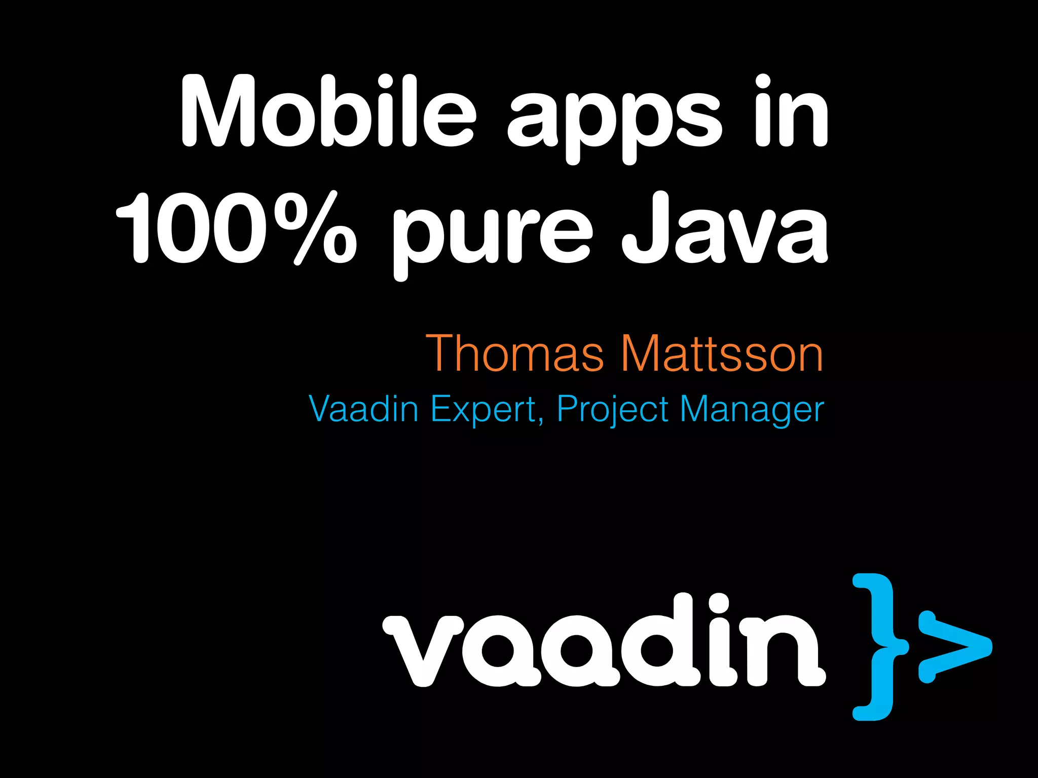 The document discusses Vaadin, a framework for developing mobile applications using 100% pure Java without the need for HTML, JavaScript, or XML. It highlights the benefits of using Vaadin, including a simplified codebase and features like theme components and offline mode. Additionally, it promotes the potential for increased productivity and provides contact information for further inquiry.
