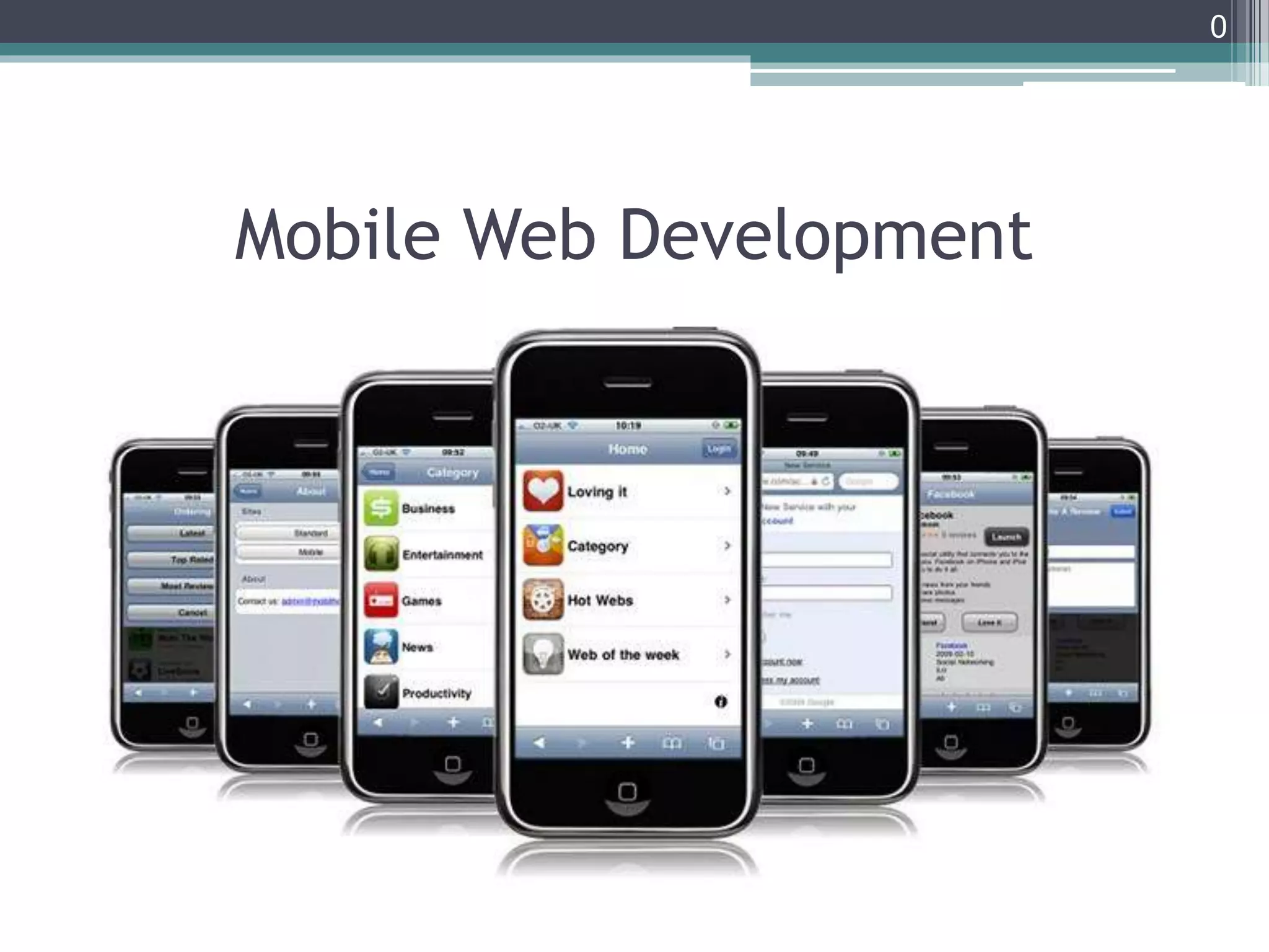 This document discusses different approaches to mobile web development, including native apps, mobile web apps, and hybrid apps. It describes native apps as using device APIs and being optimized for performance but costly to maintain across platforms. Mobile web apps use HTML, CSS, and JavaScript and are low-cost with broad compatibility but lack access to device features. Hybrid apps combine web technologies with native wrappers to access device APIs and offer "write once, run everywhere" capabilities. The document also covers mobile development strategies, frameworks, and tools like Cordova that can help build hybrid mobile apps.