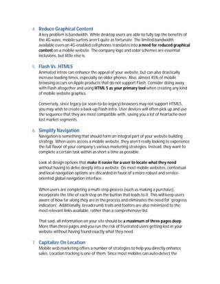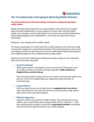This document outlines 12 fundamentals for designing and marketing effective mobile websites. It discusses how mobile web usage is growing as more people access the internet on their phones. To stay competitive, companies need a mobile-optimized website. The tips provided include keeping the site functional, simplifying navigation and graphics for small screens, using responsive design, and capitalizing on location-based and social media features. Mobile search engine optimization is also important to consider. Following these strategies can help companies develop an engaging mobile presence and reach more customers.