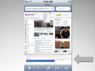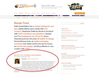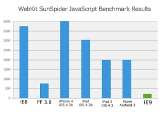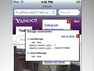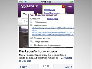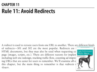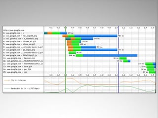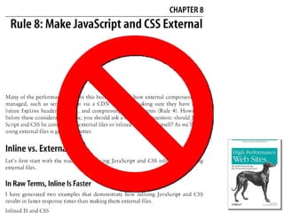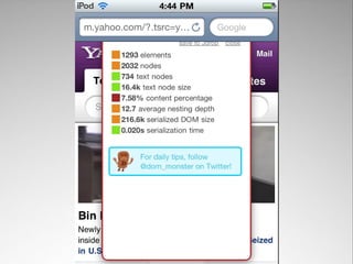 This document discusses strategies to improve mobile web performance by addressing common speed issues due to latency, device limitations, and testing practices. It emphasizes using CSS for graphics, data URIs for images to minimize HTTP requests, and keeping JavaScript and the DOM size small. The author advocates for testing and adjusting various components to enhance the efficiency of mobile applications.