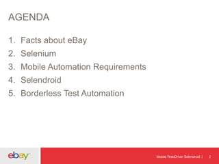 The document discusses mobile automation and the use of Selendroid for testing mobile applications, highlighting its features and capabilities. It provides insights into eBay's mobile transaction success and the infrastructure for test automation, including integration with Selenium. Additionally, it emphasizes the need for a borderless approach to testing across different platforms while seeking contributors and engagement from the audience.