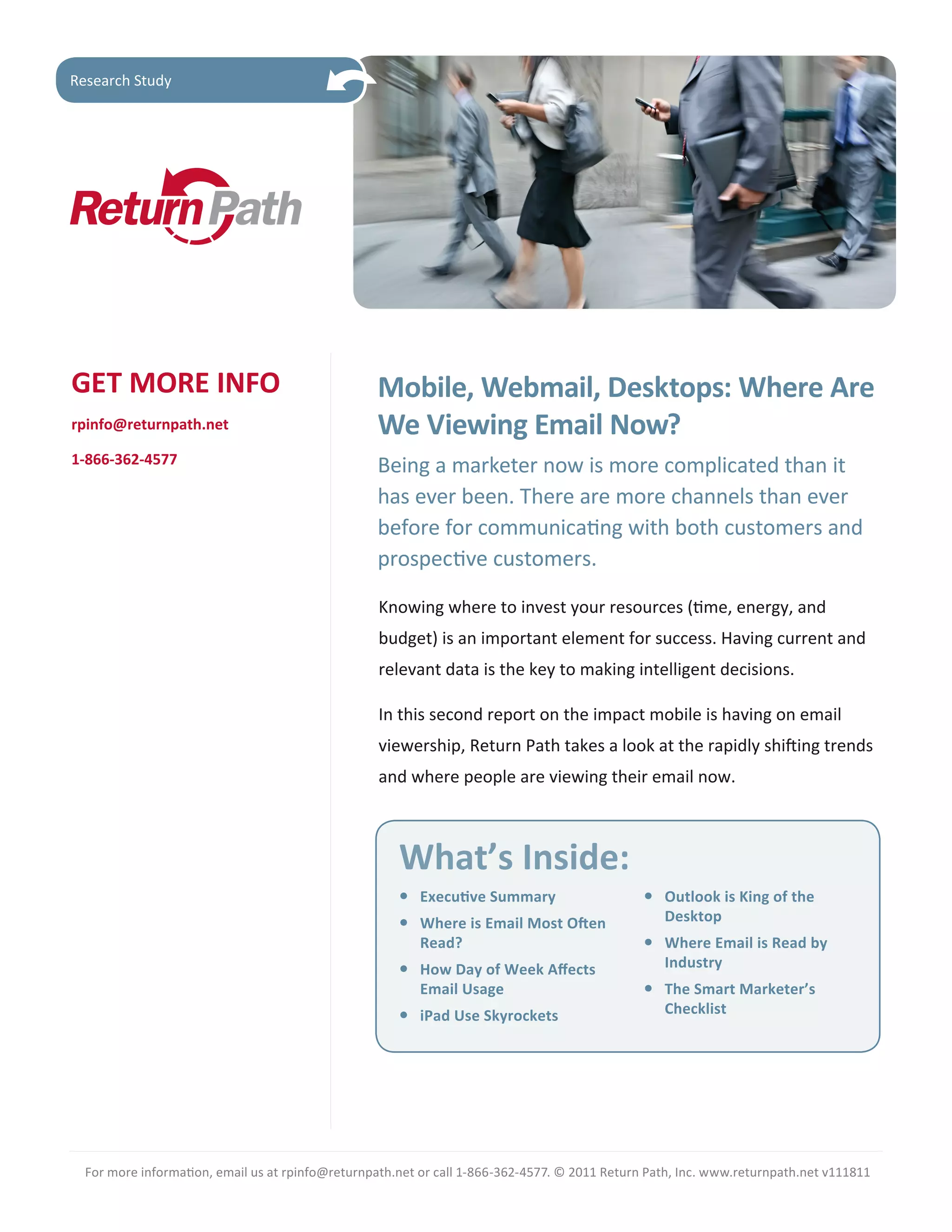 This research study examines trends in how and where people access email. It finds that while webmail remains the most popular way to access email, mobile access is growing rapidly at 34% over the past six months. Desktop access is declining slightly. Usage varies by day of week, with more desktop access on weekdays and greater mobile and webmail access on weekends. The study recommends marketers understand how their subscribers access email in order to send relevant messages through the preferred channels.