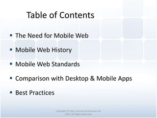 This document summarizes a presentation on mobile website development. It discusses the history of mobile web standards like WAP and XHTML-MP. It also covers the limitations of mobile devices and best practices for mobile web design, such as adapting content to different screens and using a .mobi domain. Navigation should be simplified for mobile versus desktop websites. Overall, the document provides an overview of designing websites that are optimized for mobile browsers and devices.