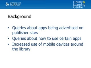 The document discusses a university library's mobile access project which aims to improve access to library resources from any device. It found that while many publishers had mobile-optimized websites or apps, not all were useful to students. Students and libraries want mobile access to be easy to use, allow full-text access offline, and not require on-campus authentication. The ideal app would have fast performance, clear navigation, single authentication, and provide full content without additional fees.