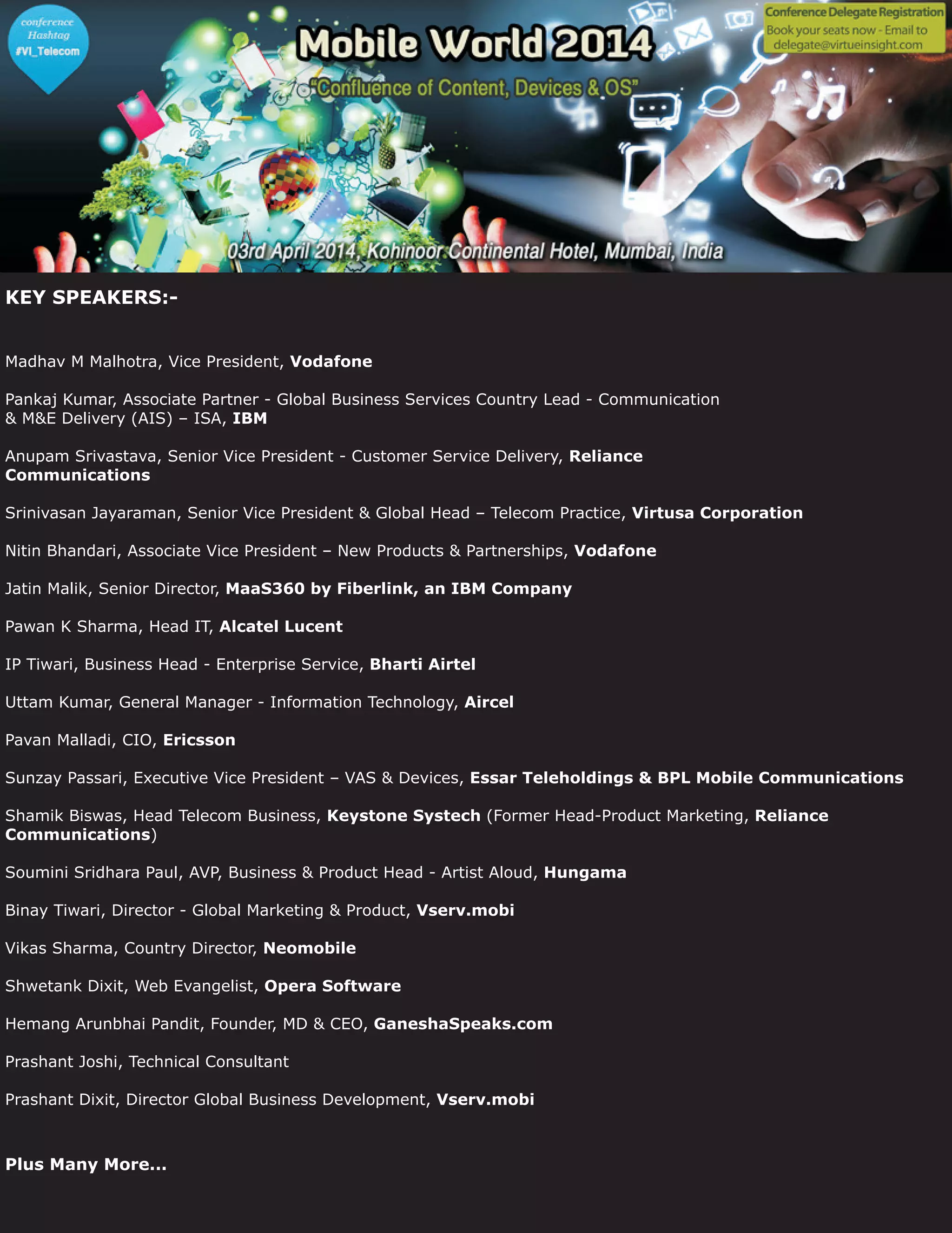 This document provides details of the Mobile World 2014 conference organized by Virtue Insight. The conference was held on 3rd April 2014 in Mumbai, India and brought together key speakers and panelists from major mobile operators, device manufacturers, content providers and other organizations.