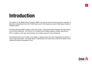 Mobile World Congress 2013 was the 8th time the major mobile industry event was held in Barcelona, gathering over 72,000 visitors and 1,700 companies. The summary highlights developments in devices such as new Samsung, Nokia, and LG phones and tablets. It also discusses operating systems including Windows Phone, Firefox OS, Tizen, and Ubuntu mobile OS. Trends in enterprise mobility like mobile device management and security were prominent. Developments in retail mobile payments using NFC and mobile point-of-sale solutions were also covered.