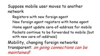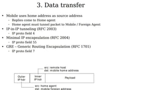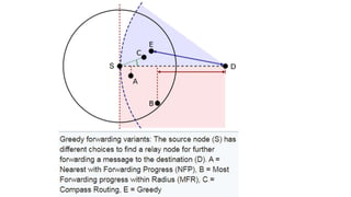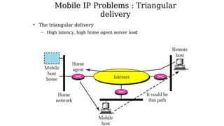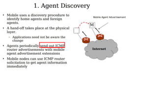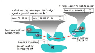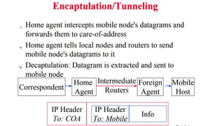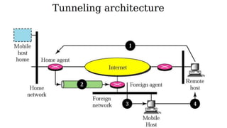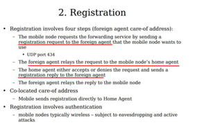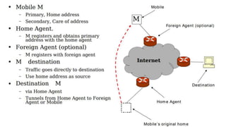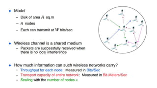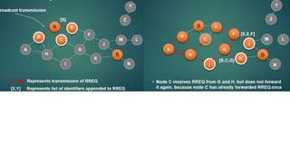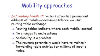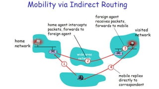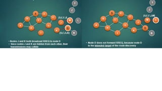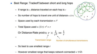 The lecture discusses routing in mobile wireless networks. It covers issues like limited transmission range, mobility-induced route changes, and security hazards in wireless transmissions. Various routing protocols are introduced, including proactive protocols that maintain routing information independently, on-demand protocols that discover routes only when needed, and hybrid approaches that combine the two. Specific protocols discussed include DSR, AODV, ZRP, LAR, and protocols for mesh and cellular networks. The tradeoffs between different routing approaches are also summarized.