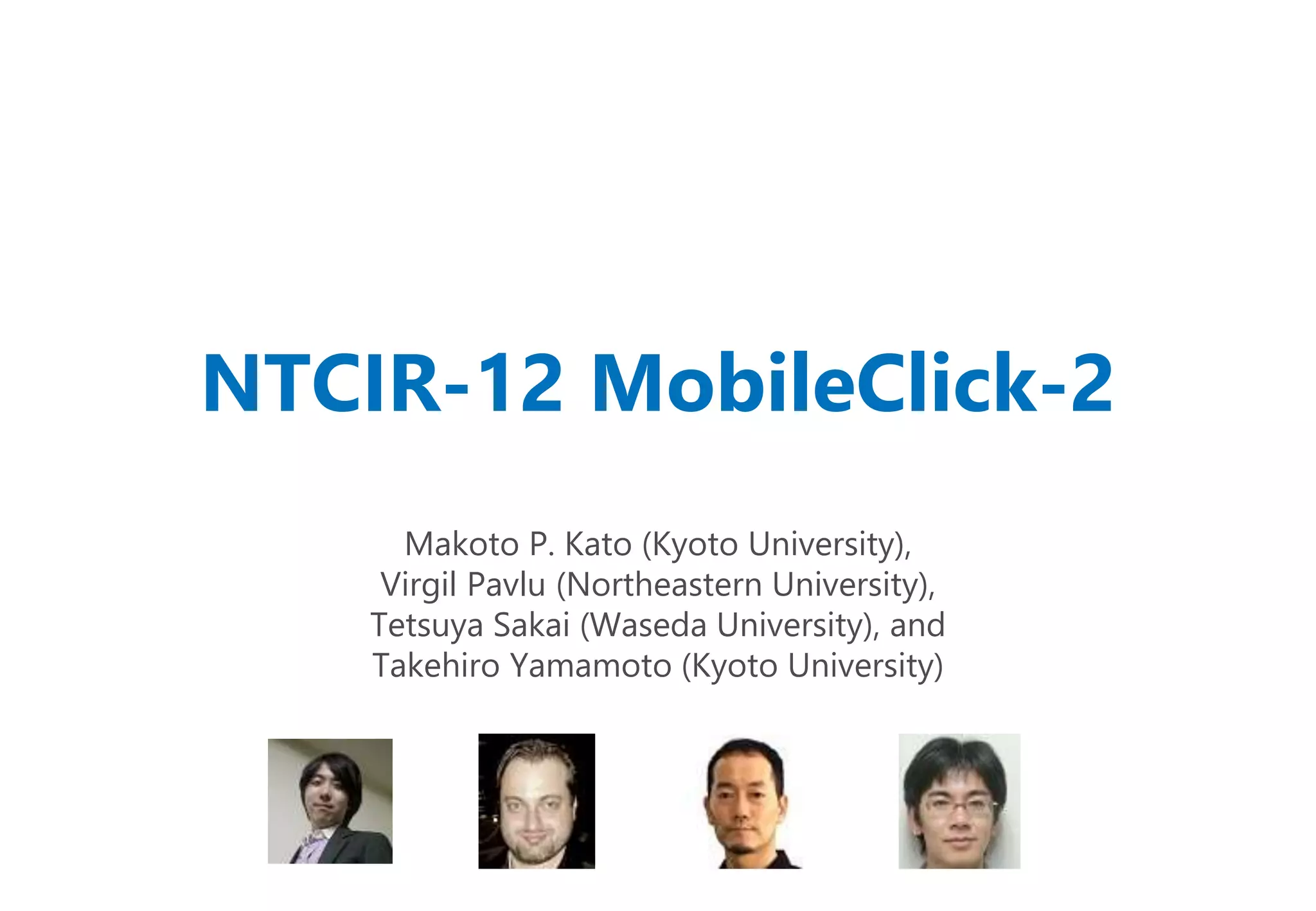 NTCIR is a series of evaluation workshops designed to enhance research in information access technologies. The NTCIR-12 workshop was held in June 2016 in Tokyo, Japan. The MobileClick-2 task at NTCIR-12 included two subtasks: an iUnit ranking subtask that evaluated systems' ability to predict the importance of information snippets for a given query, and an iUnit summarization subtask to generate a two-layer summary of information snippets and subtopics. The MobileClick-2 task schedule included releasing the test queries in August 2015 and a submission deadline in December 2015.
