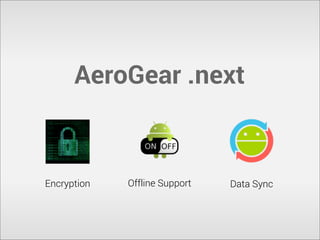 AeroGear is a set of libraries that simplify and unify mobile development across platforms through modules that handle common tasks like authentication, storage, and communication. It has a pluggable and configurable architecture and aims to cut down on repetitive infrastructure work. AeroGear provides libraries for authentication, storage, communication, and plans to add encryption, offline support, and data sync in future versions.