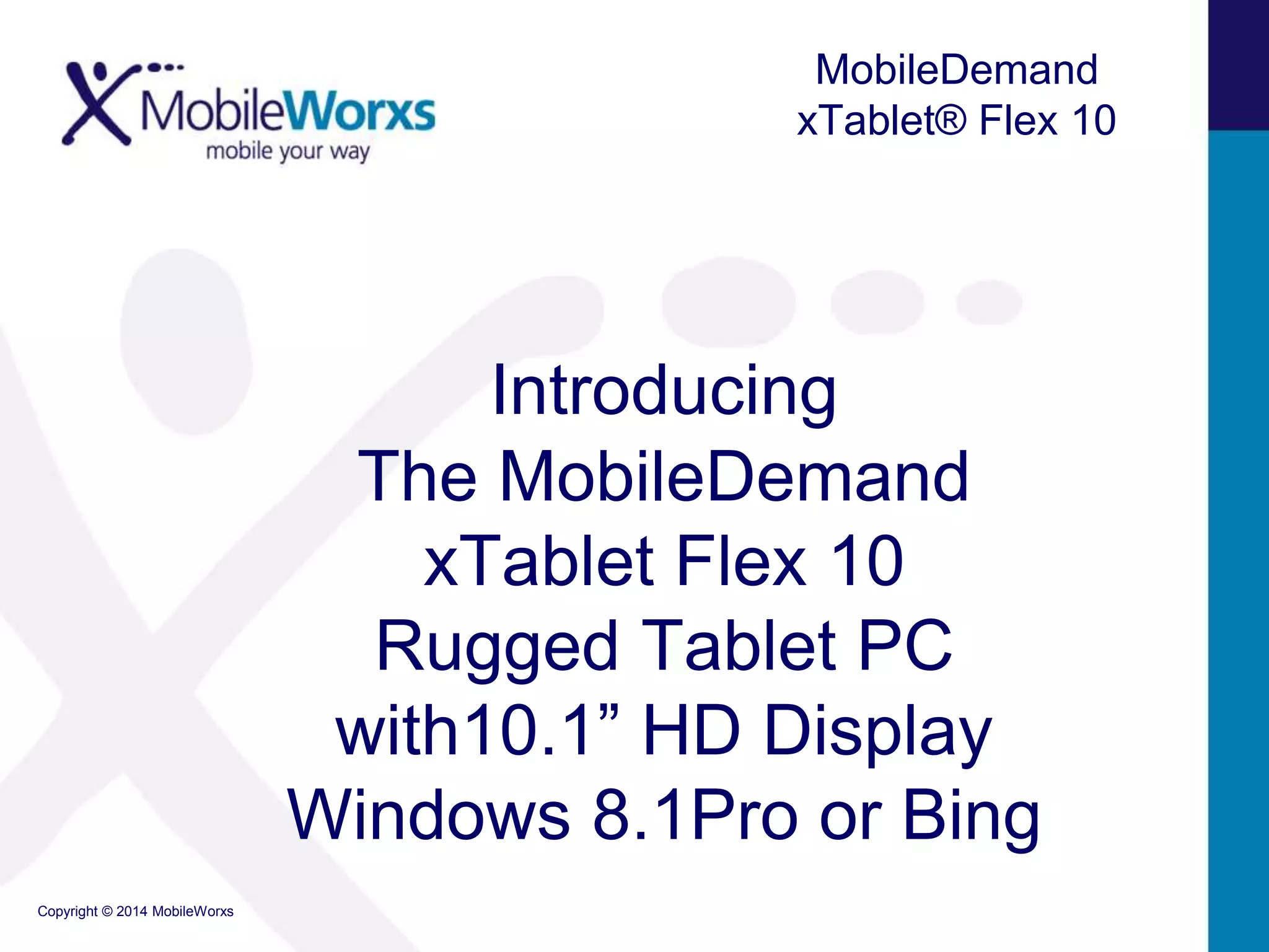 The document introduces the MobileDemand xTablet Flex 10, a lightweight and rugged tablet PC featuring a 10.1” HD display, Windows 8.1 Pro/Bing, and a variety of connectivity options. It is designed for various applications including field service, logistics, and healthcare, and boasts specifications such as drop resistance and a 6-hour battery life. The device includes dual cameras and offers a one-year warranty.