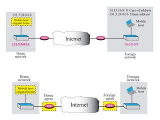 Mobile IP is an open standard that allows devices to change networks while maintaining the same IP address. This ensures ongoing connections and applications are not dropped when switching networks. It works by assigning two IP addresses - a static home address and a care-of address that changes based on the device's current network location. When the device roams away from its home network, its traffic is encapsulated and tunneled through its home network to maintain connectivity using its home address. Mobile IP provides mobility across IP networks while cellular IP focuses on optimizing mobility within cellular networks.