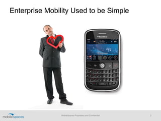MobileSpaces provides an app virtualization solution that allows enterprises to securely manage any app on any personal device. It addresses the growing complexity of enterprise mobility with more devices, apps, and stakeholders to satisfy. MobileSpaces virtualizes apps to give them a native user experience while allowing IT control. The solution is managed through a cloud-based console. MobileSpaces targets medium to large enterprises and aims to help them manage risk, mobilize apps, and enable BYOD programs, offering their SaaS solution for $5 per device per month.