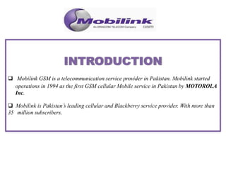 Mobilink is Pakistan's leading cellular and Blackberry service provider with over 35 million subscribers. It started operations in 1994 as the first GSM cellular provider in Pakistan. Mobilink uses e-marketing techniques like direct marketing, interactive voice response, and digital agents to engage customers and generate awareness of its brands and services. It employs both pull strategies like personalized web pages and FAQs as well as push strategies like email marketing and banners.