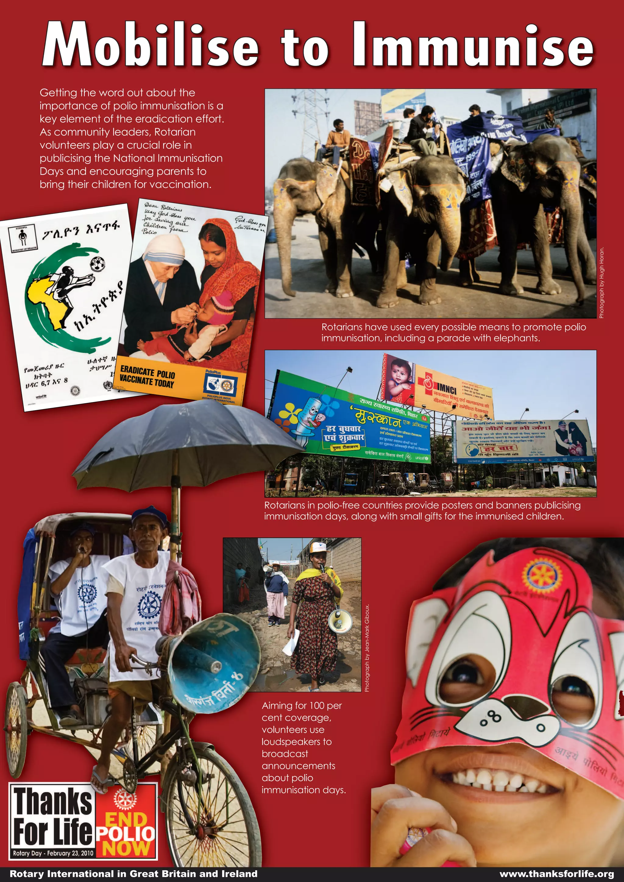 Rotarians play a crucial role in publicizing National Immunization Days and encouraging parents to bring their children for polio vaccination. They use various means to promote immunization, including parades with elephants, posters, banners, and announcements over loudspeakers. The goal is to mobilize communities and achieve 100% vaccination coverage to help eradicate polio through immunization efforts.