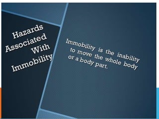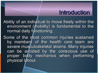 This document discusses principles of body mechanics and effects on the integumentary system. It outlines several principles of proper body mechanics that can help conserve energy and avoid injury, such as maintaining balance and stability, performing pelvic tilts, facing the direction of work, moving objects on a level surface close to the body, and using smooth continuous movements. It also defines several types of skin injuries or conditions that can result from pressure, shear forces, abrasions, or prolonged moisture contact like maceration.