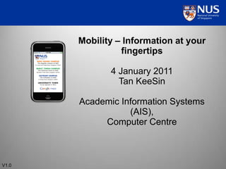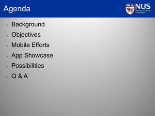 The document discusses advancements in mobile computing, predicting that essential information will be universally accessible on portable devices within five years. It outlines the objectives and applications of mobile efforts in academic settings, showcasing a mobile portal for various platforms and functional apps enhancing user experience. It includes examples of uses in education and research, encouraging engagement and feedback from users.