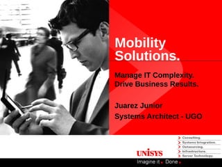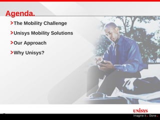 This document discusses Unisys' mobility solutions and services. It outlines the challenges of enterprise mobility including IT planning, management, and demonstrating business value. Unisys' approach includes helping clients manage personal devices used by employees and integrating them securely into business processes. The company offers comprehensive mobility solutions tailored to each client's needs, with global reach and advisory, transformation, and managed services.