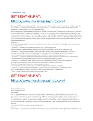 The document outlines a mobilization plan for a healthcare organization that commits 20 nurses to participate in a multinational effort to treat patients exposed to a highly contagious virus in Africa. It emphasizes the importance of inclusive communication, organizational structure, and cultural competence in delivering effective care and ensuring patient safety during the mission. The presentation should include analysis of stakeholders, staffing impacts, organizational roles, and potential diversity issues, along with clear writing and APA formatting.