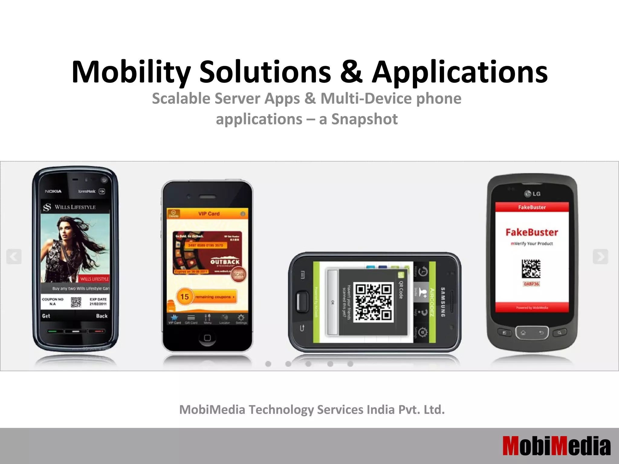 Mobimedia Technology Services specializes in innovative mobility solutions, offering products for mobile marketing and commerce across multiple platforms such as Nokia, Blackberry, Android, and iPhone. Their services include developing applications for campaign management, QR code marketing, mobile coupons, and banking solutions, utilizing technologies like Java, J2EE, and PHP. With a focus on scalable, hosted services and a strong development team, Mobimedia has delivered numerous projects globally in their three years of operation.